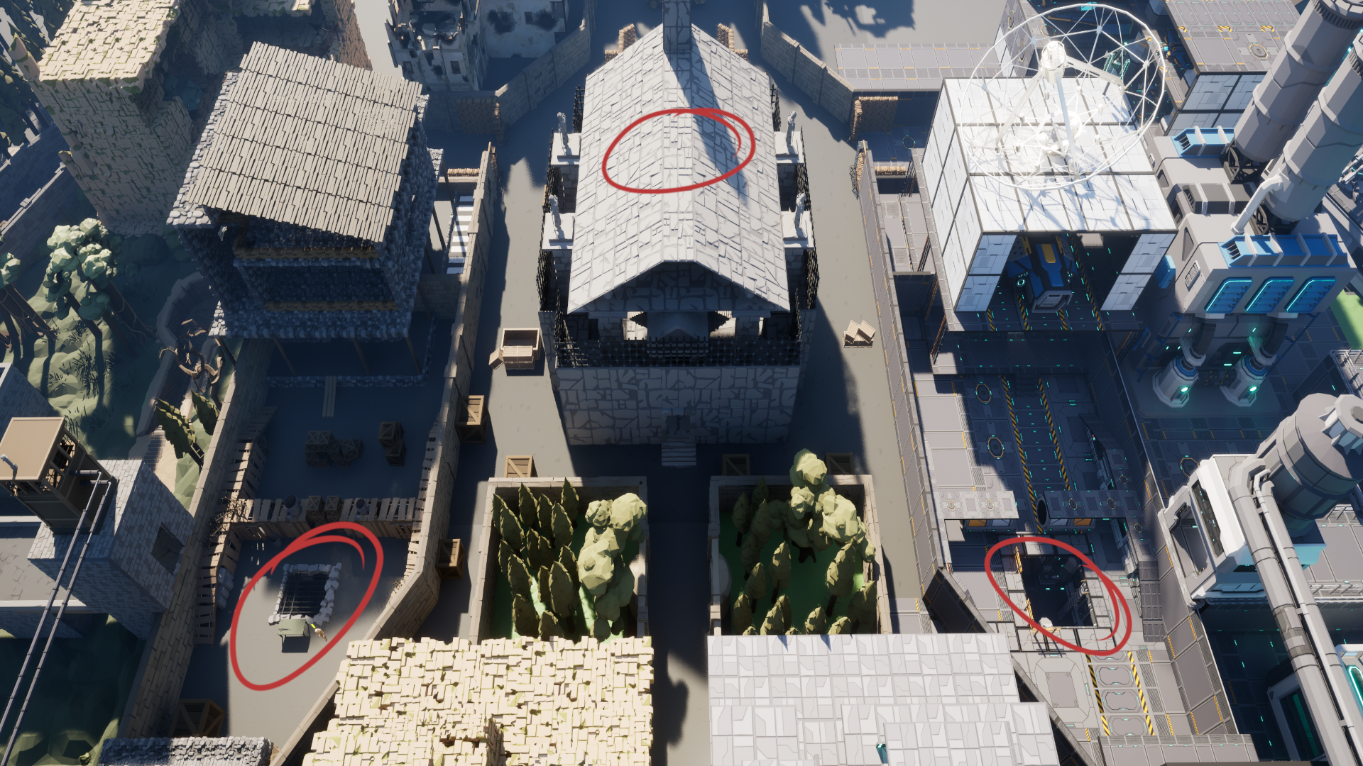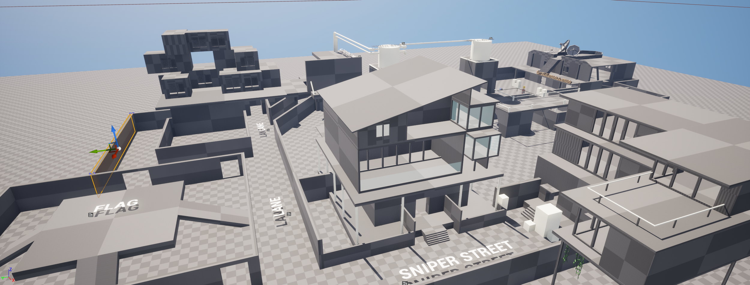 Each building shown in the image was carefully assembled piece by piece within Unreal Engine. The layout was intentionally designed to provide players with several distinct pathways to access the flag room, encouraging a variety of tactical approaches and promoting dynamic movement throughout the map.